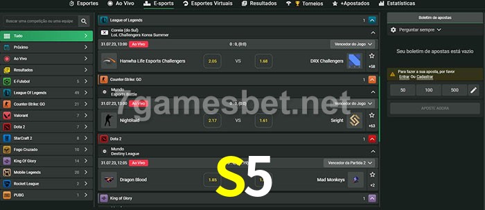 O S5 oferece uma grande seleção de opções de apostas em e-sports com probabilidades competitivas